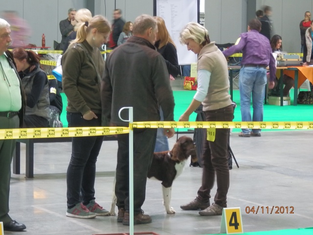 V neděli 4.11.2012 jsme se vydali s naší Barrou na mezinárodní výstavu do Prahy. Cestu zvládla v naprosté pohodě. Horší již bylo čekání na posuzování. Před námi v kruhu bylo cca 40 psů - převážně maďarských ohařů. Po dvou hodinách začala být Barča nervózní a nechtěla setrvat na jednom místě, další hoďka už byla kritická. Při vstupu do kruhu se tvářila velice otráveně a vypadalo to, že se ani nerozběhne. Nakonec se nechala přesvědčit a přesto, že se tvářila znudeně, obdržela známku Výborná 1